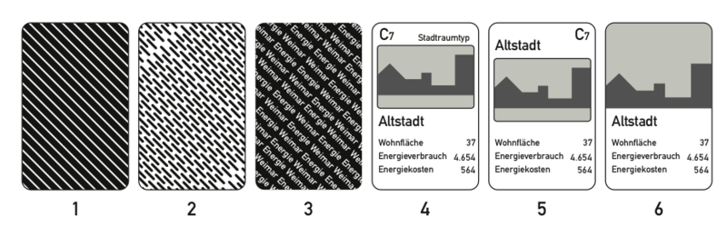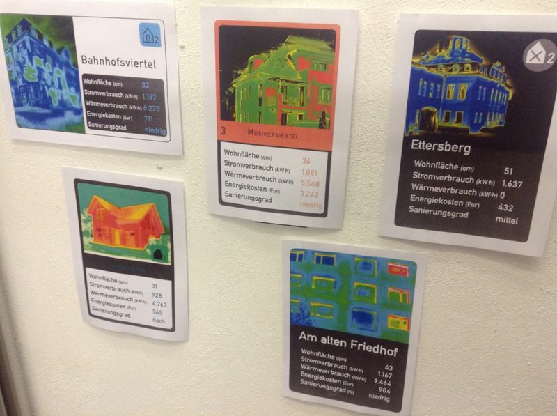 In welchem Stadtviertel sind die Energiekosten am höchsten? Wo wird am meisten Strom und Wärme benötigt? Und welchen Zusammenhang gibt es zwischen Bauweise, Wohnfläche und Energieverbrauch? Das Energie-Kartenspiel lässt Weimarer Stadtviertel gegeneinander antreten und soll spielerisch und unterhaltsam Interesse wecken und Aufmerksamkeit erzeugen für das Thema der Energieeffizienz in der Stadt. Das Spiel soll mit der Unterstützung von Sponsoren produziert und in öffentlichen Einrichtungen zur Verfügung gestellt werden.